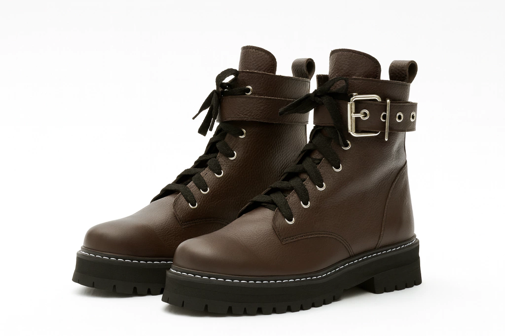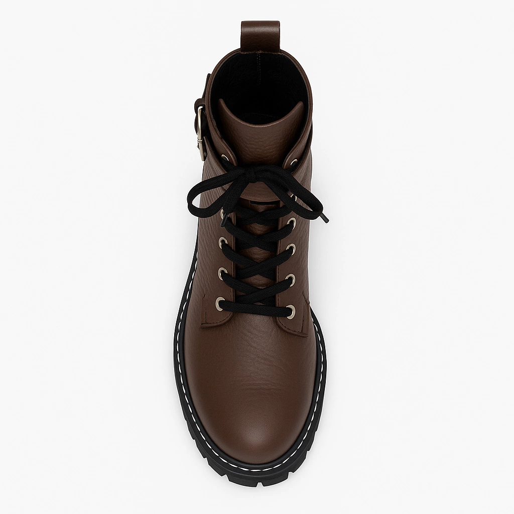Borcegos acordonados de caña media. Realizados 100% en cuero vacuno chocolate con cordones y un cinturón en la caña con hebilla plateada. Su cuero es texturizado, con una trama.