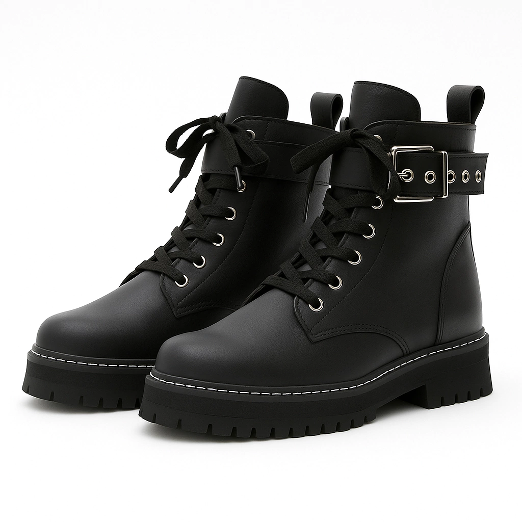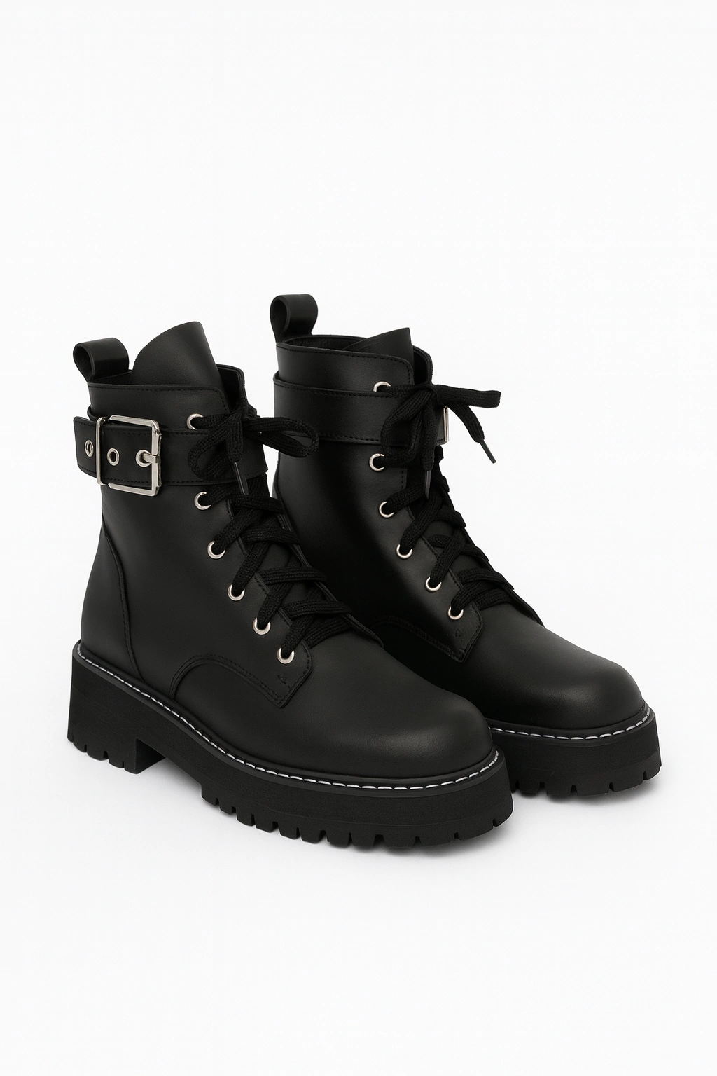 Borcegos acordonados de caña media. Realizados 100% en cuero vacuno negro con cordones y un cinturón en la caña con hebilla plateada. Su cuero es texturizado, con una trama.