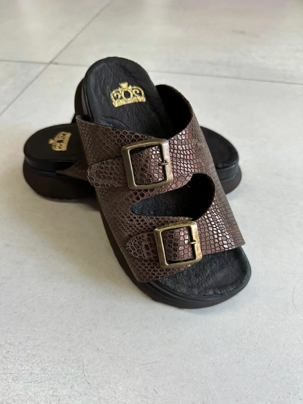 Las sandalias SAONA están realizadas en cuero reptil cobre. Con doble hebillas metálicas que permiten ajustar su capellada para sostener bien el pie.