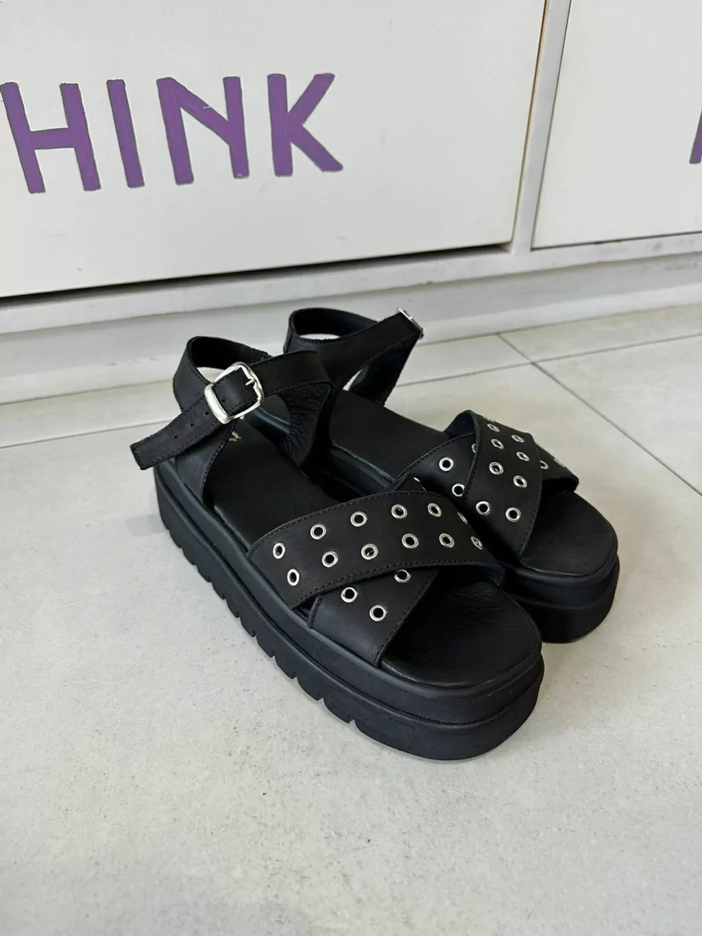 Su base Tap es de goma eva y mide 5 cm. y la amamos por su comodidad. Su capellada está realizada en cuero negro liso, con el detalle de las arandelas en ambas tiras cruzadas.